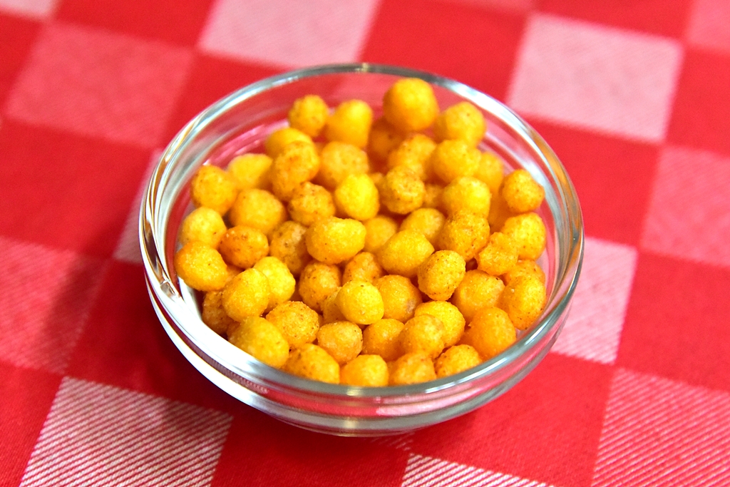 1. Corn Snack (แถมฟรี) – แป้งข้าวโพดกรุบกรอบเม็ดเล็กสีเหลืองทองสำหรับทานเล่นแบบฟรีๆ