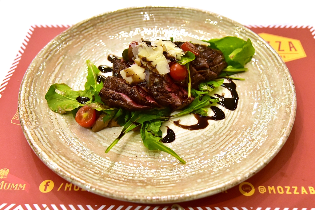 5. Wagyu Flank Steak (890++ THB) [15/20] – สเต็กเนื้อวากิวส่วน flank ที่มีรสสัมผัสแบบเคี้ยวสนุกเสิร์ฟคู่กับสลัดผักร็อกเก็ตและมะเขือเทศเชอร์รี โรยหน้าด้วยะพาร์มีซานชีส