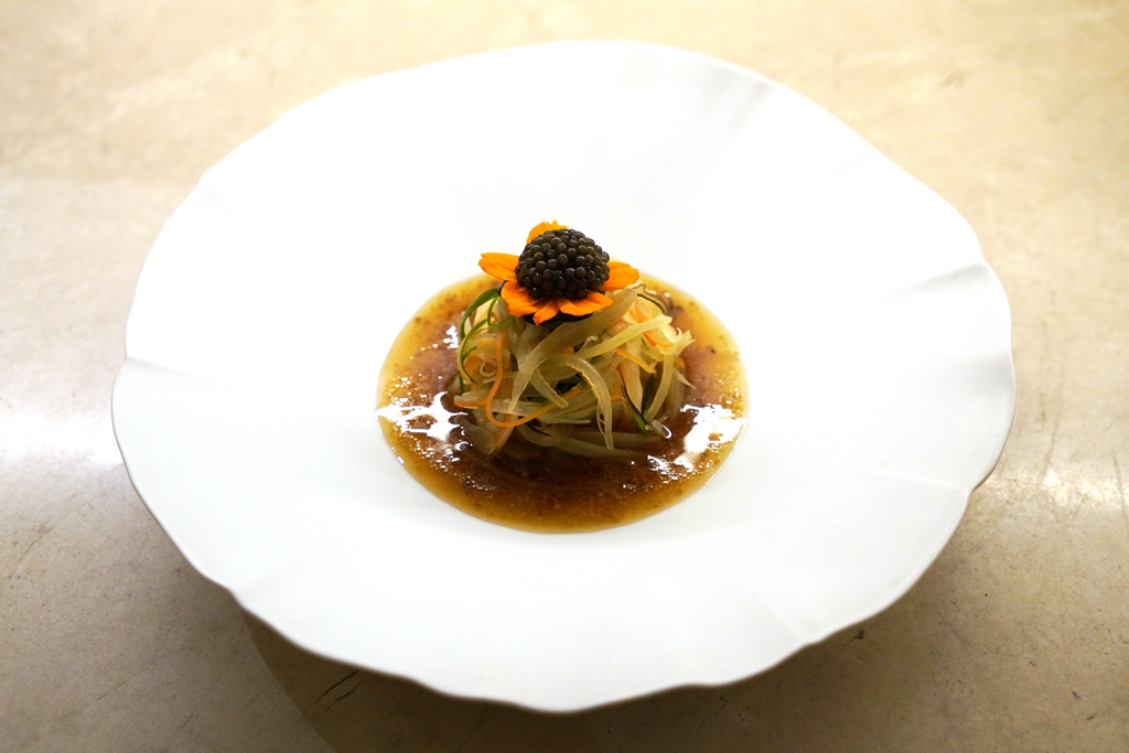 1st course : yangjangpi | cuttlefish | autumn vegetables | caviar [16/20] – ยำผักหลากสีและเส้นแป้งมันเสิร์ฟพร้อมกับเนื้อปลาหมึกกระดองและไข่ปลาคาเวียร์ราดด้วยน้ำสลัดมัสตาร์ดและงา