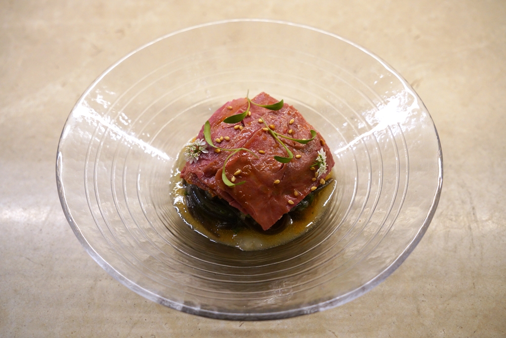 2nd course : memilmyeon | buckwheat | white kimchi | o-hyang jangyuk [18/20] – บะหมี่เย็นเส้นบัควีทเนื้อหนึบหนับเสิร์ฟคู่กับเนื้อตุ๋นกับเครื่องเทศห้าชนิดในซอสไข่ปลาบินรสเผ็ดหวาน