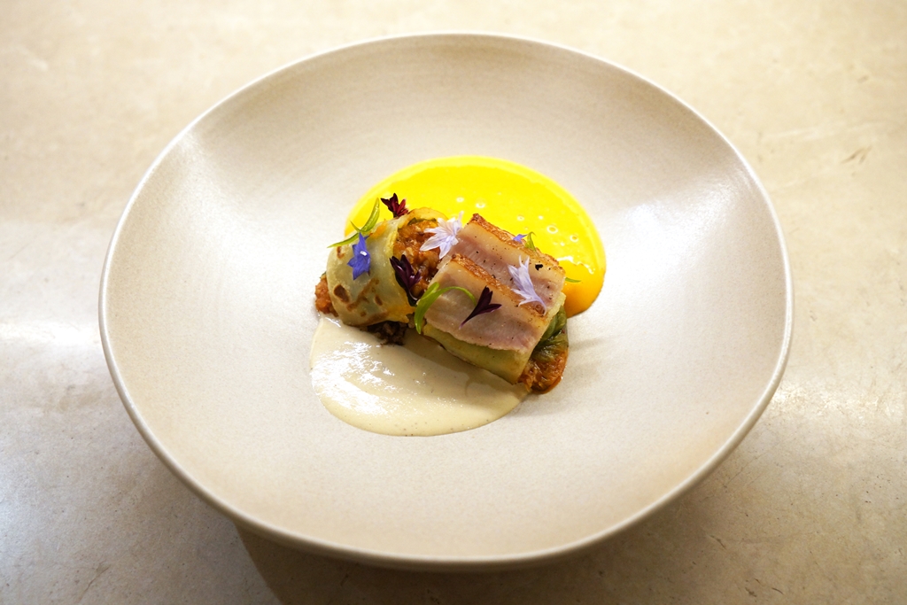 3rd course : chunbing | potato crepe | kimchi sabayon | pork cheek [17/20] – แป้งมันฝรั่งเนื้อหนึบห่อสตูว์กิมจิเบค่อนเสิร์ฟคู่กับแก้มหมูย่าง ซอสไพน์นัทครีมและซอมกิมจิซาบายอน