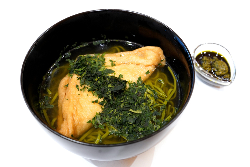 2. Kitsune Matcha Buckwheat Noodles (1,600 JPY) [17/20] – โซบะเส้นชาเขียวสีเขียวสดเนื้อหนึบเสิร์ฟในน้ำซุปใสร้อนๆที่เติมรสความอูมามิด้วยใบชาเทนฉะเสิร์ฟคู่กับเต้าหู้ทอดตุ๋นในซอสรสหวาน ถือเป็นโซบะที่มีเส้นยอดเยี่ยม ซุปยอดเยี่ยมและเครื่องที่ยอดเยี่ยม