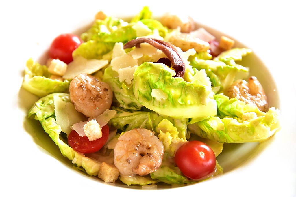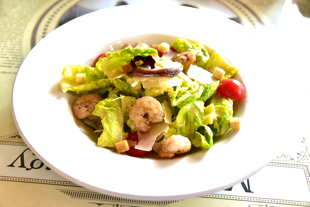 3. New York Caesar Salad (5,200 HUF) – ซีซาร์สลัดรสเข้มข้นเสิร์ฟคู่กับกุ้งย่างและเนื้อปลาแอนโชวี่
