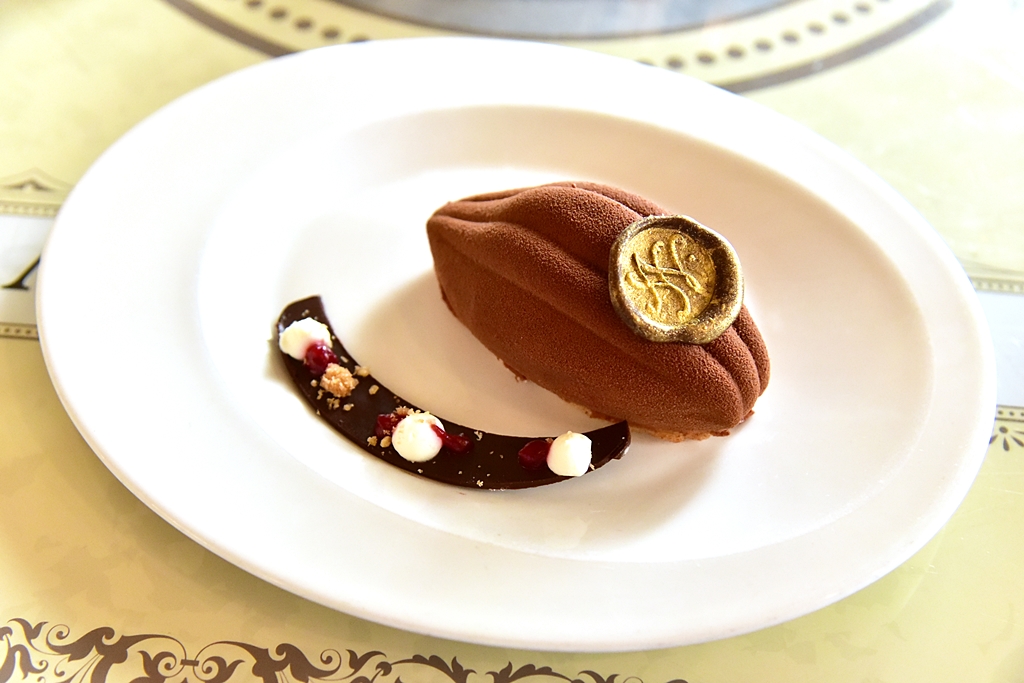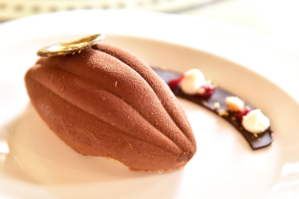 6. New York Chocolate Cake (2,950 HUF) – เค้กช็อกโกแลตมูสเนื้อนุ่มรูปทรงผลโกโก้เสิร์ฟคู่กับช็อกโกแลต