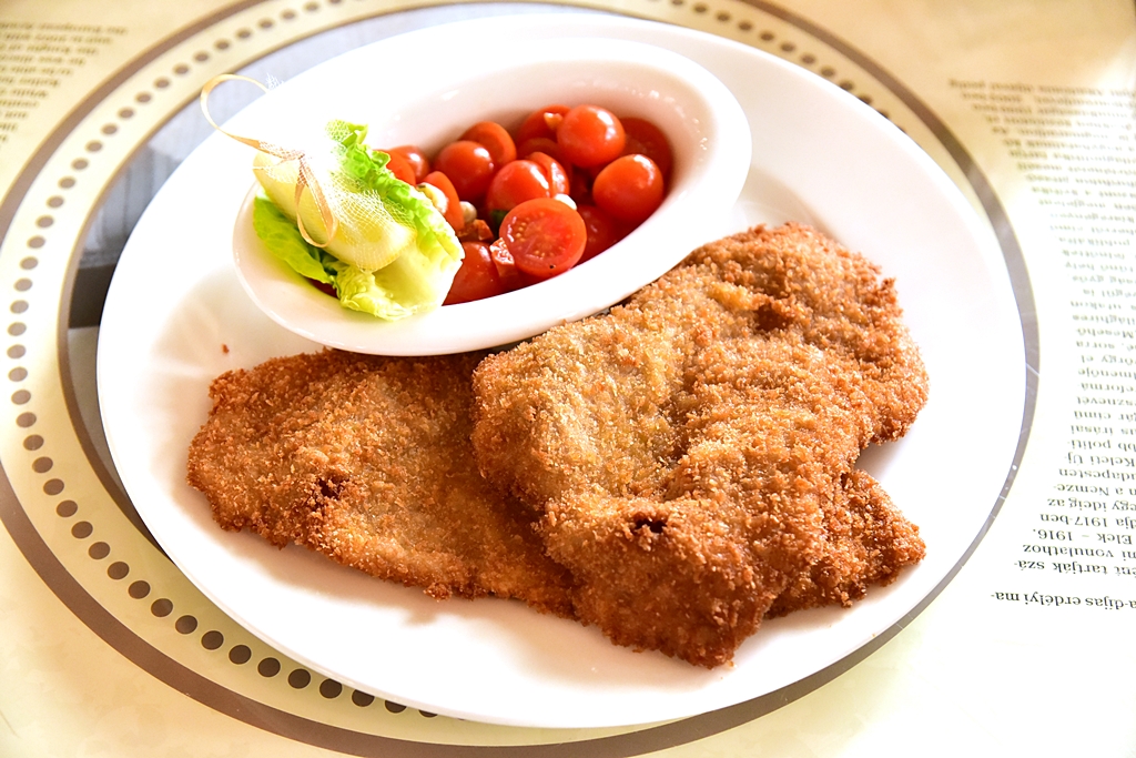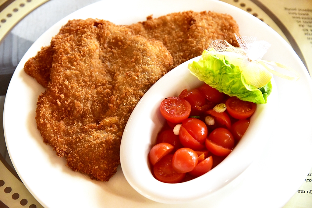 4. Wiener Schnitzel with Tomato Salad (7,500 HUF) – เนื้อลูกวัวชุบเกล็ดขนมปังทอดเสิร์ฟคู่กับสลัดมะเขือเทศ