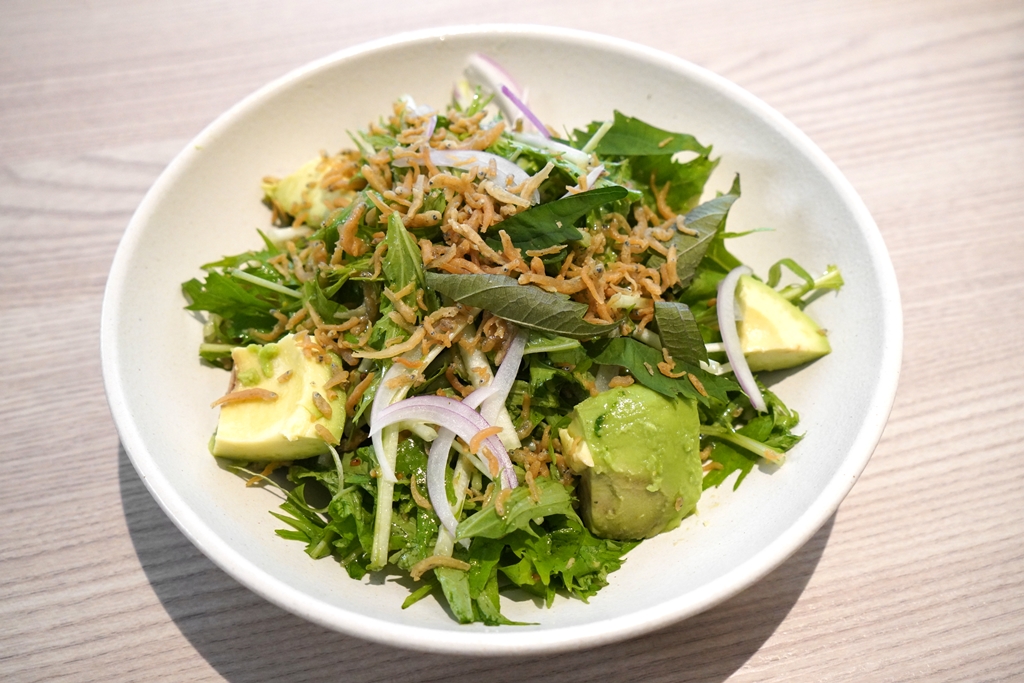 1. Mizuna Salad (320++ THB) [15/20] – สลัดผักมิซูน่าเนื้อกรอบเสิร์ฟคู่กับอโวคาโดและปลาเงินทอดกรอบราดน้ำสลัดยูสุ
