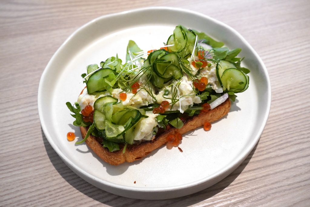 3. Wasabi Crab Toast (340++ THB) [14/20] – โทสต์ขนมปังยูดาเนะหน้าเนื้อปูซอสมาโยวาซาบิ ไข่ปลาแซลม่อนและสลัดผักร็อกเก็ต