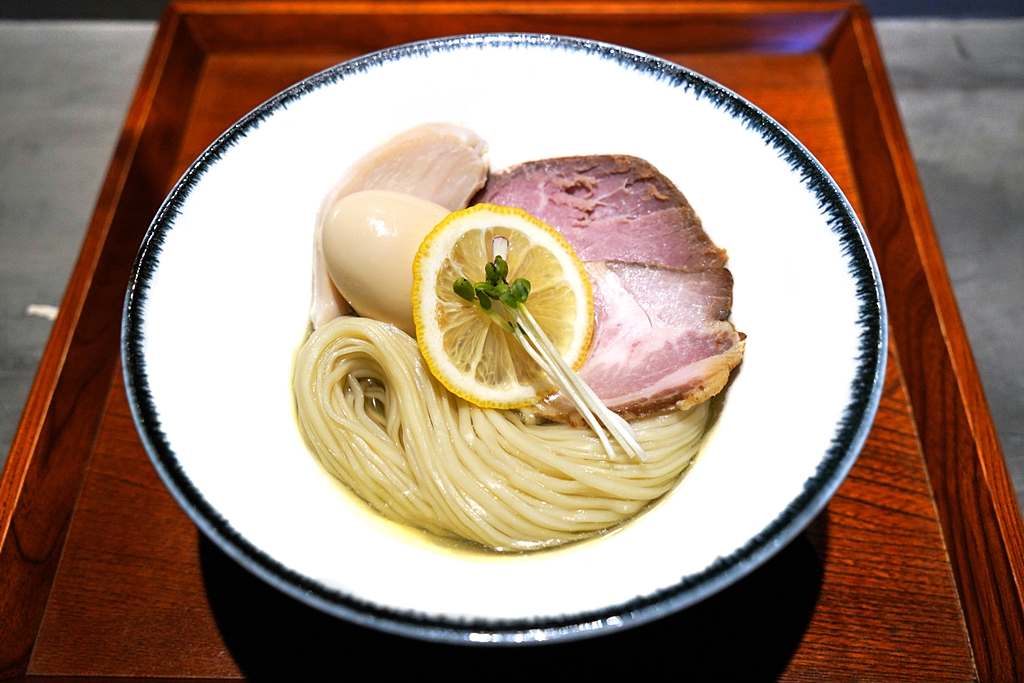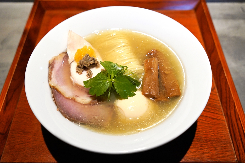 1. Tokusei Shio Soba (450++ THB) [16/20] – ราเมนซุปเกลือที่เชฟเลือกดึงรสชาติความอูมามิจากเบสที่เป็นซุปไก่และอาหารทะเลหลากหลายชนิด ทั้ง หอยเชลล์ หอยตลับ ปลาแห้งและสาหร่ายคอมบุมาผสมเข้ากับเกลือจากฮอกไกโดและโอกินาวา เสิร์ฟพร้อมกับเส้นราเมนเหนียวเด้งกำลังดี ชาชูเนื้อหมูและไก่ที่ผ่านการซูวีด์ ไข่ต้มดาชิและหน่อไม้ดอง นอกจากนั้น ยังมีซอสเห็ดสับและส้มยูสุที่เสิร์ฟมาคู่กันเพื่อปรับรสชาติของราเมนได้ตามชอบ ซึ่งเชฟแนะนำให้ทานรสชาติแบบเดิมก่อนครึ่งถ้วยแล้วจึงค่อยผสมเห็ดกับยูสุเข้าไปให้รสชาติเปลี่ยน ซึ่งโดยรวมแล้วรสชาติของซุปดีจริงๆทั้งแบบก่อนและหลังผสมเลยครับ