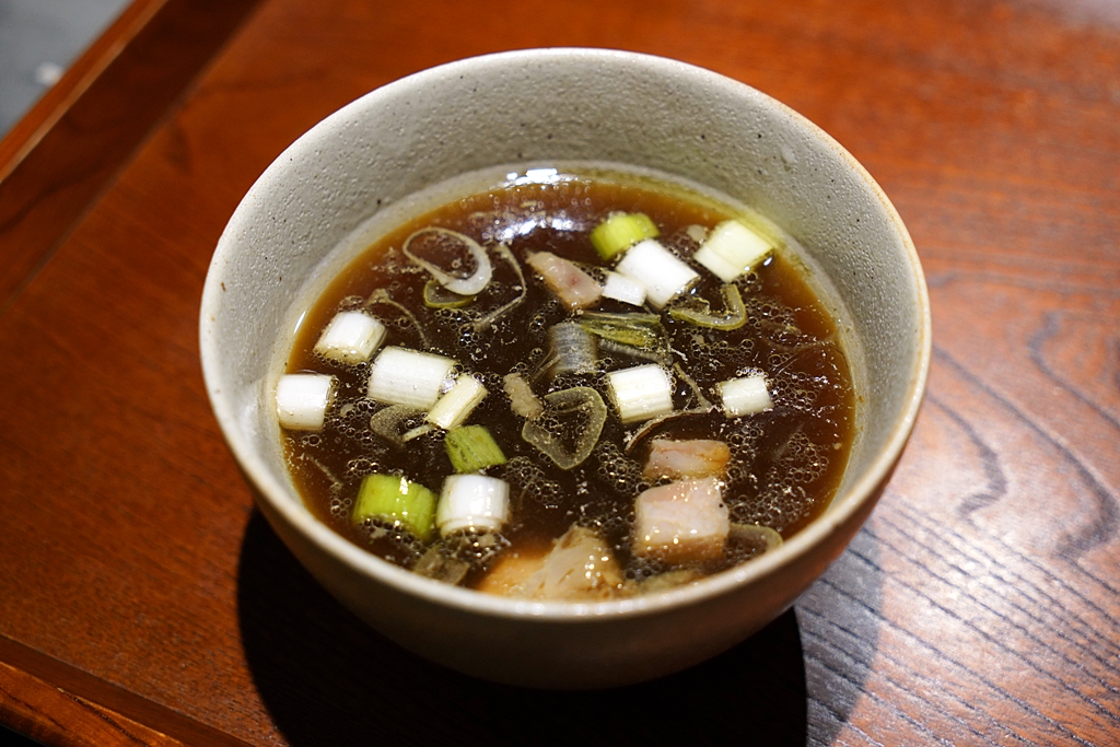2. Tokusei Kombusui Tsuke Soba (470++ THB) [15/20] – สึเคเมนสูตรเฉพาะของ No Name Noodle ที่เชฟเลือกเสิร์ฟเส้นแบบขนาดเล็กกว่าสึเคเมนทั่วไปแต่ยังคงความเหนียวหนึบในซุปดาชิเพื่อคงความสดของเส้นให้ลื่นไม่ติดกันเคียงคู่กับซอสจิ้มที่ทำจากโชยุสี่ชนิดที่ผ่านการเอจอีกหนึ่งเดือนเต็มมาผสมกับน้ำซุปดาชิจากสาหร่ายคอมบุและปลาแห้ง พร้อมด้วยเครื่องเคียงอย่างชาชูหมู ชาชูไก่ ไข่ต้มดาชิและหน่อไม้ดอง โดยรวมรสชาติของซอสจะมีความเค็มอูมามิซึ่งก็เข้ากับเส้นได้ดีเลยครับ ถ้าเริ่มเลี่ยนก็สามารถเติมน้ำมันบ๊วยและน้ำมันพริกเพิ่มรสชาติได้เช่นกัน