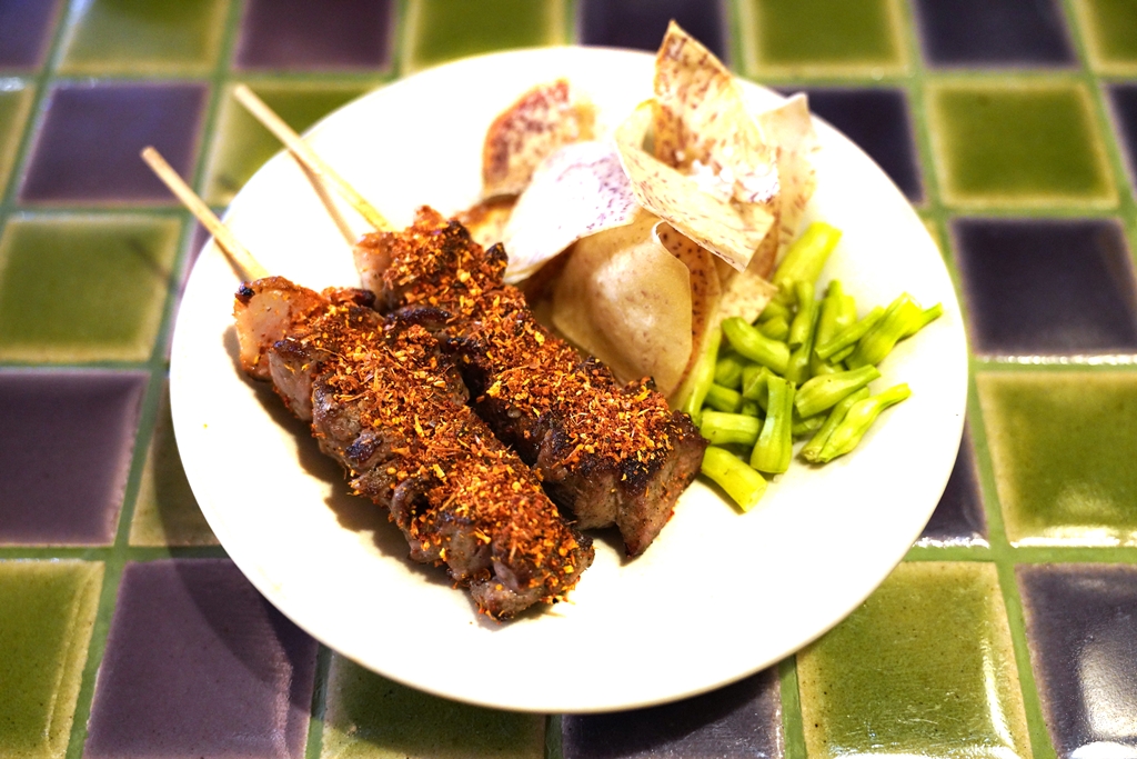 5. Grilled Beef Skewers with Galangal Chili & Local Radish (580++ THB) [15/20] – เนื้อภูพานปิ้งเสียบไม้ย่างถ่านกับน้ำพริกข่าเสิร์ฟคู่กับผักขี้หูดและเผือกทอด