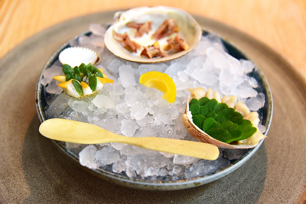 2nd course: Seafood Platter [Carpet Clam, Venus Clam, Mahogany Clam] – หอยแคลมสามชนิดประจำทะเลแถบสแกนดิเนเวียนนำมาเสิร์ฟสามรูปแบบคู่กับผลไม้ตระกูลไซตรัสชื่อ quince หอยทั้งสามชนิดแตกต่างกันและเข้ากับเครื่องเคียงที่ให้มาดีมาก ชอบมากๆๆๆๆ