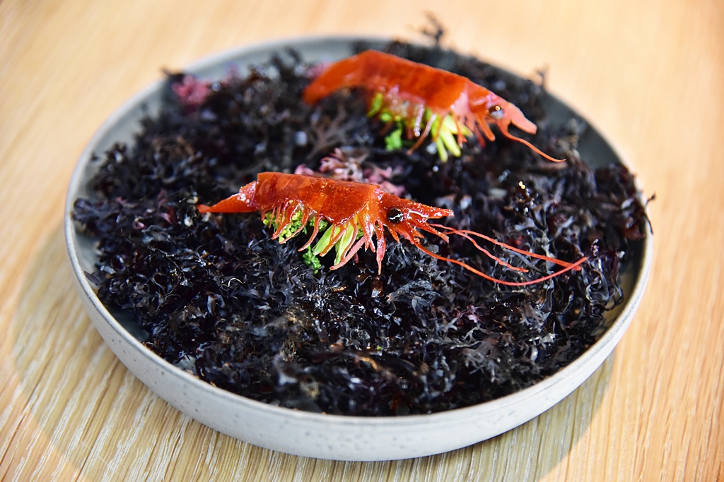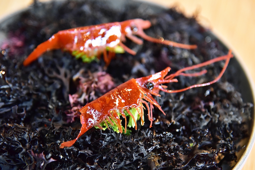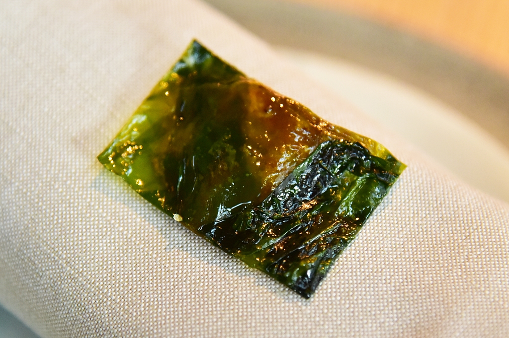 4th course: Grey Shrimp cooked with Sea Lettuce – เนื้อกุ้งเกรย์ชริมป์ในผักกาดทะเลที่ทำเลียนแบบราวิโอลี ตัวรสชาตินี่เข้มข้นหอมอร่อย