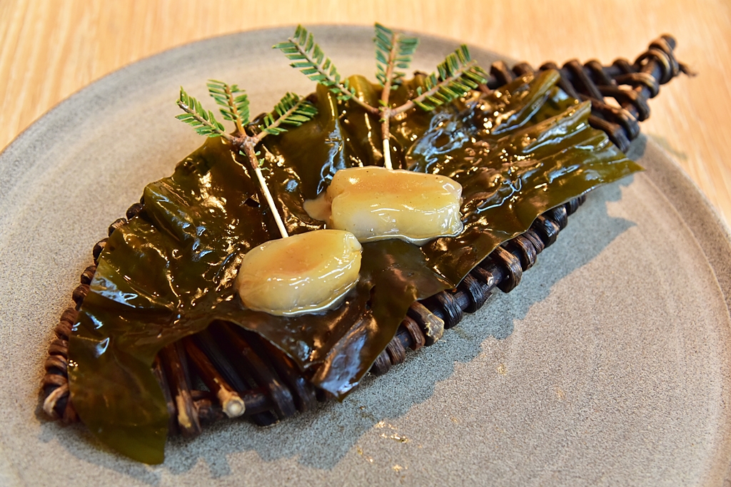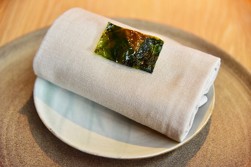 6th course: Cured Turbot – เนื้อปลาเทอร์บอตชิ้นพอดีคำหมักกับซอสมิโสะรสหวานหอมเสิร์ฟบนสาหร่ายทะเล ถือเป็นเมนูเนื้อปลาที่ทำรสสัมผัสออกมาได้ยอดเยี่ยมและรสชาติก็เยี่ยมยอดครับ