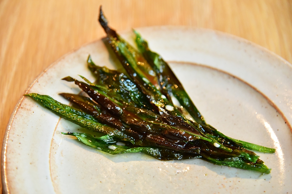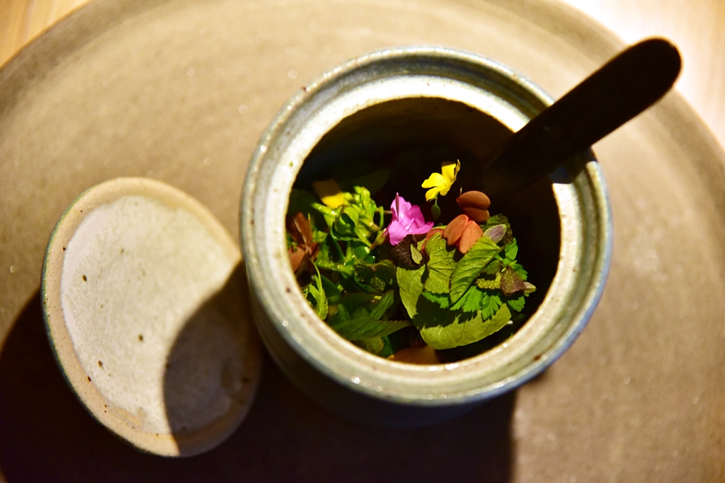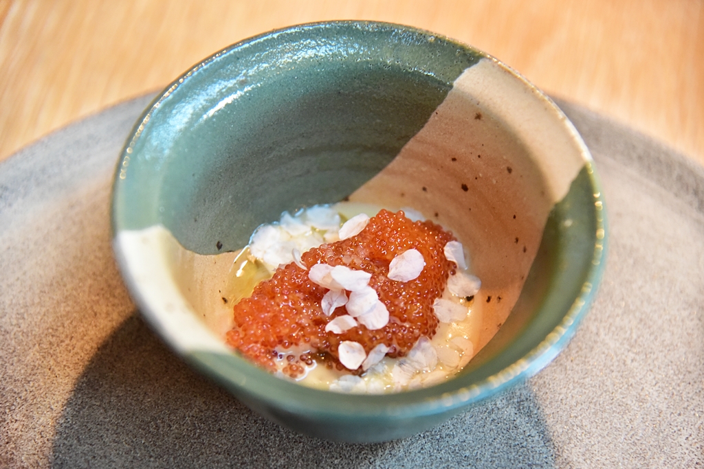 5th course: Lumpfish Roe and Cured Egg Yolk with Ramson – ไข่ปลาลัมป์ฟิชเสิร์ฟในไข่แดงหมักโรยหน้าด้วยใบซากุระหอมๆเสิร์ฟคู่กับใบกระเทียมป่าย่างแบบเกรียมนิดๆ ทานคู่กันนี่สวรรค์เลย