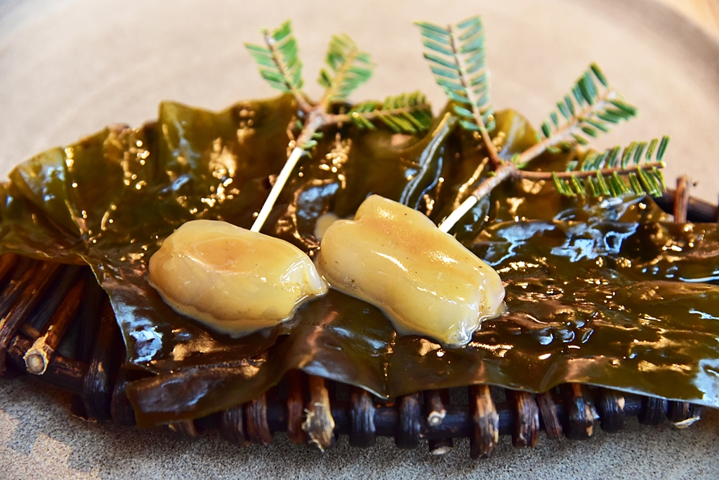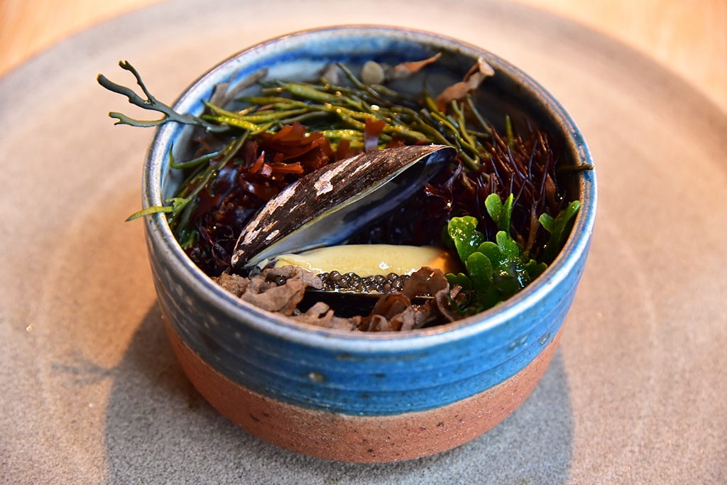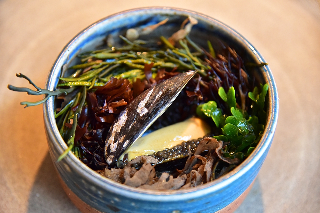 7th course: Medium Rare Blue Shell Mussel – เมนูที่มีความอลังการมากที่สุดในคอร์สกับเนื้อหอยแมลงภู่ที่คัดมาเฉพาะส่วนเนื้อก่อนนำมาปรุงแบบพอสุกเสิร์ฟคู่กับไข่ปลาคาเวียร์ในซุปสาหร่าย
