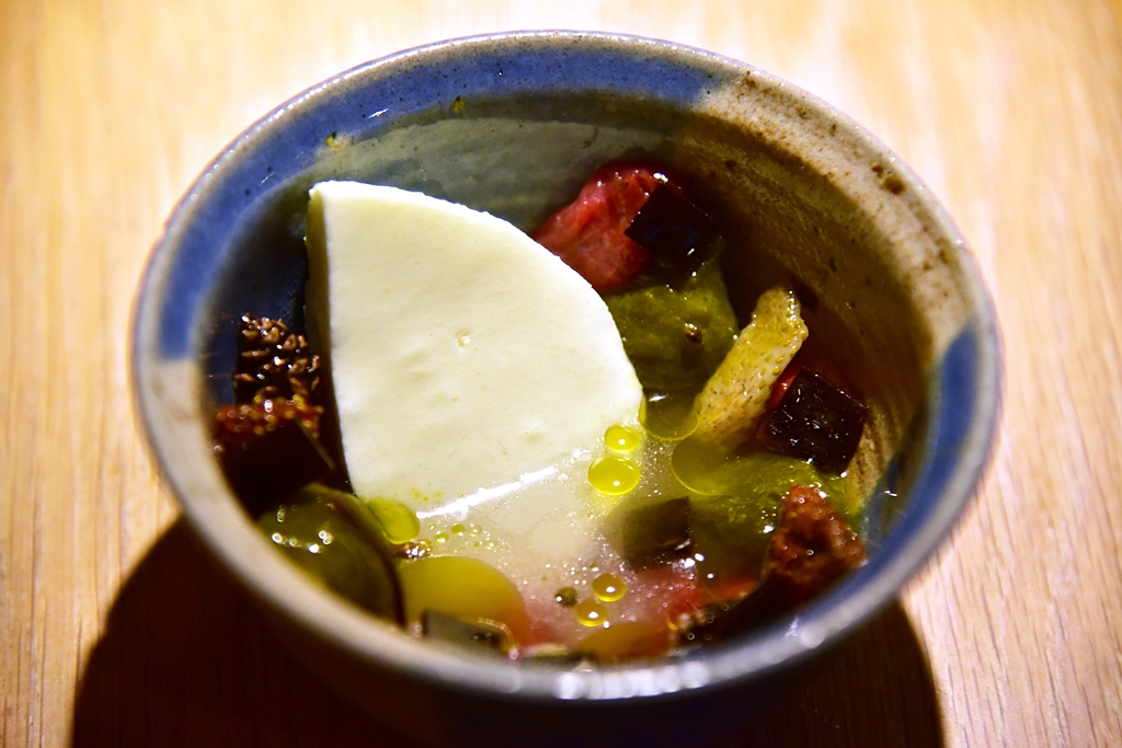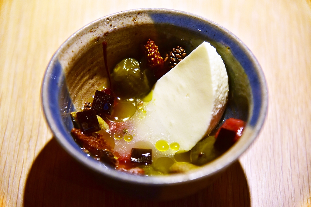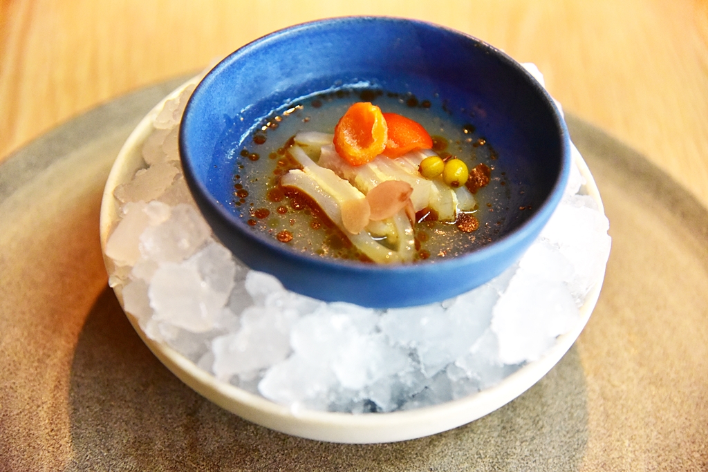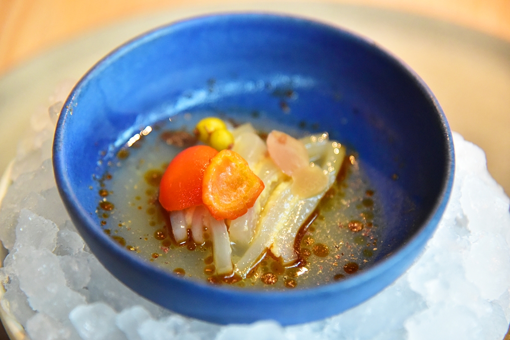 8th course: Cod Bladder simmered with Quince – กะเพราะปลาค้อดที่นำมาปรุงได้อย่างดีจนมีรสสัมผัสที่เหนียวหนึบหนับเสิร์ฟในน้ำซุปเย็นปรุงรสเผ็ดกับผลไม้ 3 ชนิด