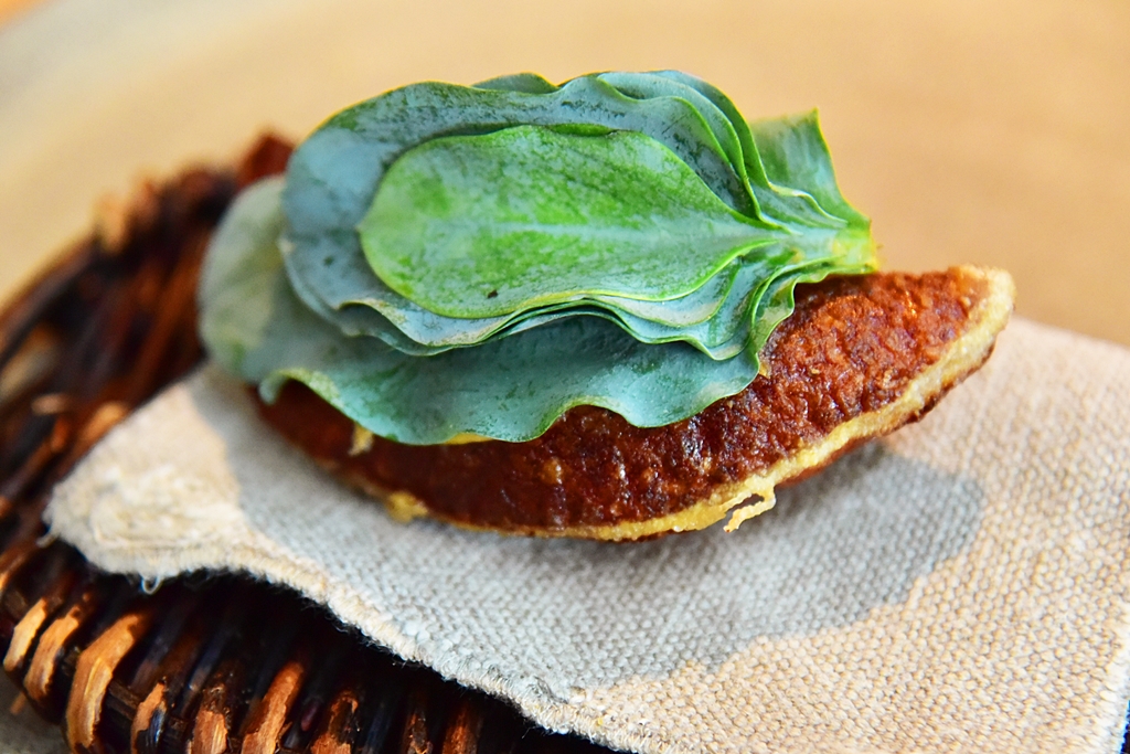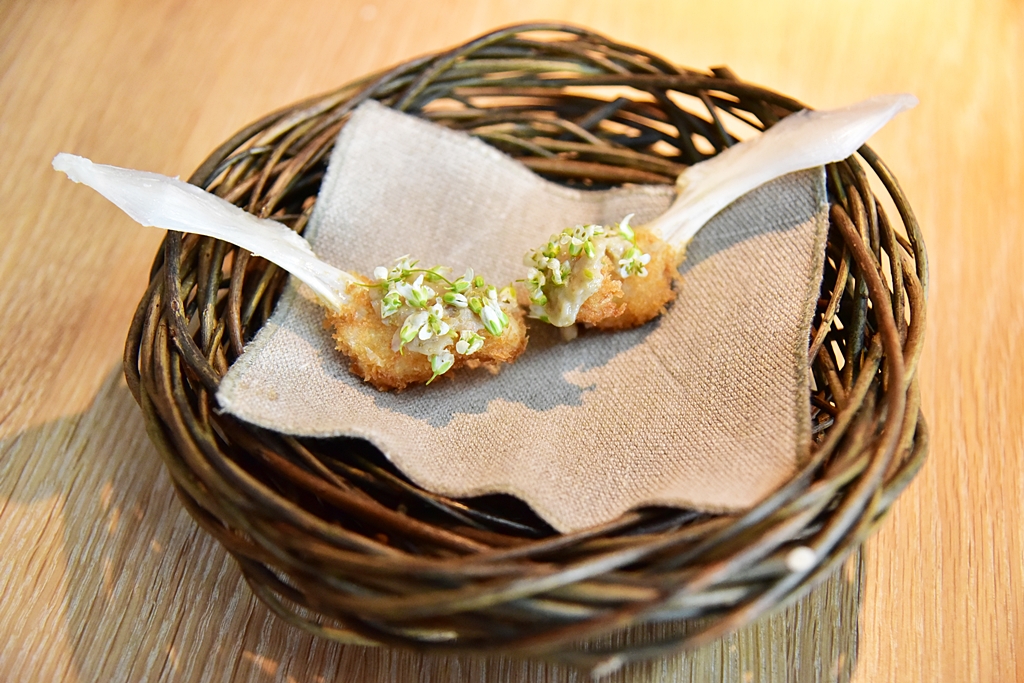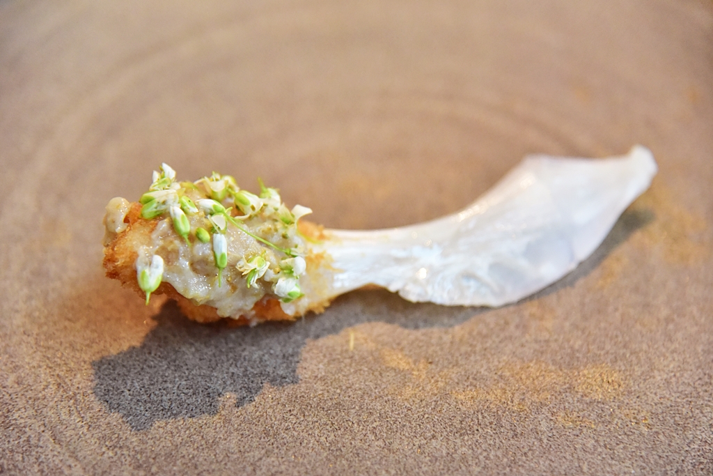 9th course: Cod Tongue Schnitzel – ลิ้นของปลาค้อดชุบแป้งทอดที่มีความโดดเด่นมากๆในด้านรสสัมผัสของเนื้อส่วนลิ้นปลาที่มีความกรอบเบาแปลกใหม่มากจริงๆ