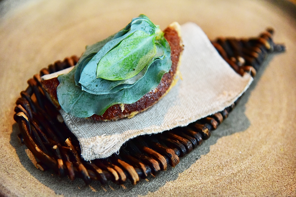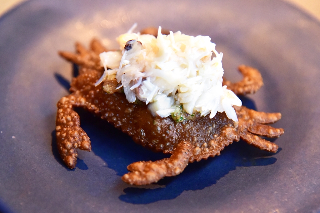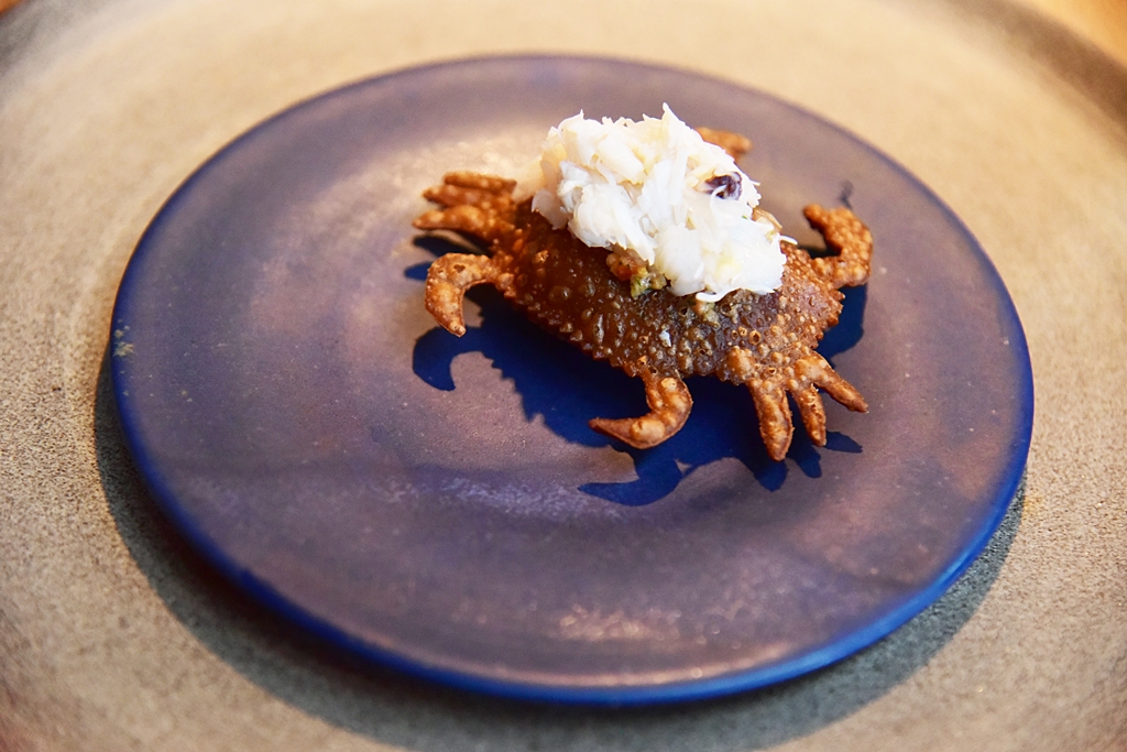 12th course: Boiled Brown Crab on Flatbread – เนื้อปูบราวแคร้บเสิร์ฟบนขนมปังกรอบสอดไส้แกงเครื่องเทศเนื้อปู ถือเป็นเมนูที่อร่อยและน่ารักมากๆเลย