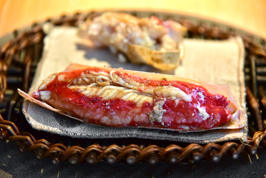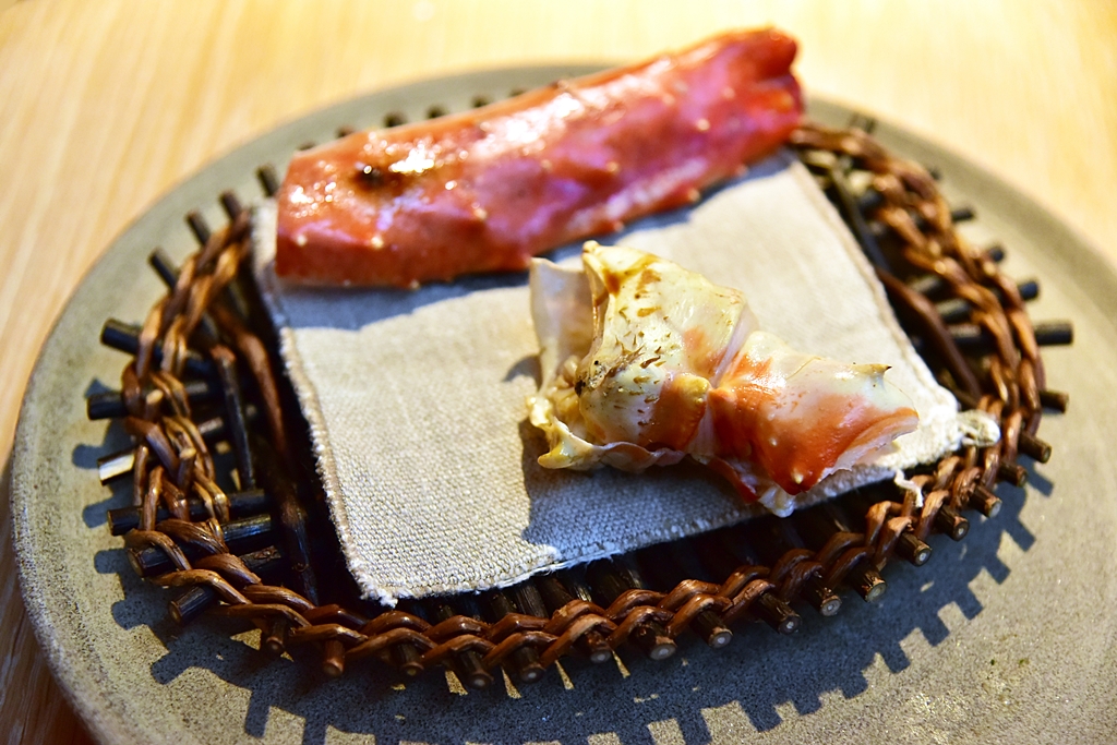 13th course: Hot Smoked, then Barbecued Arctic King Crab – ไฮไลต์ของมื้อนี้กับขาปูอลาสก้าชิ้นใหญ่ยักษ์ที่รมควันและย่างมาแล้วเป็นอย่างดีเสิร์ฟคู่กับซอสฮอร์ชแรดิช ตัวเนื้อปูนี่นุ่มหวานฉ่ำ โคตรอร่อย !!