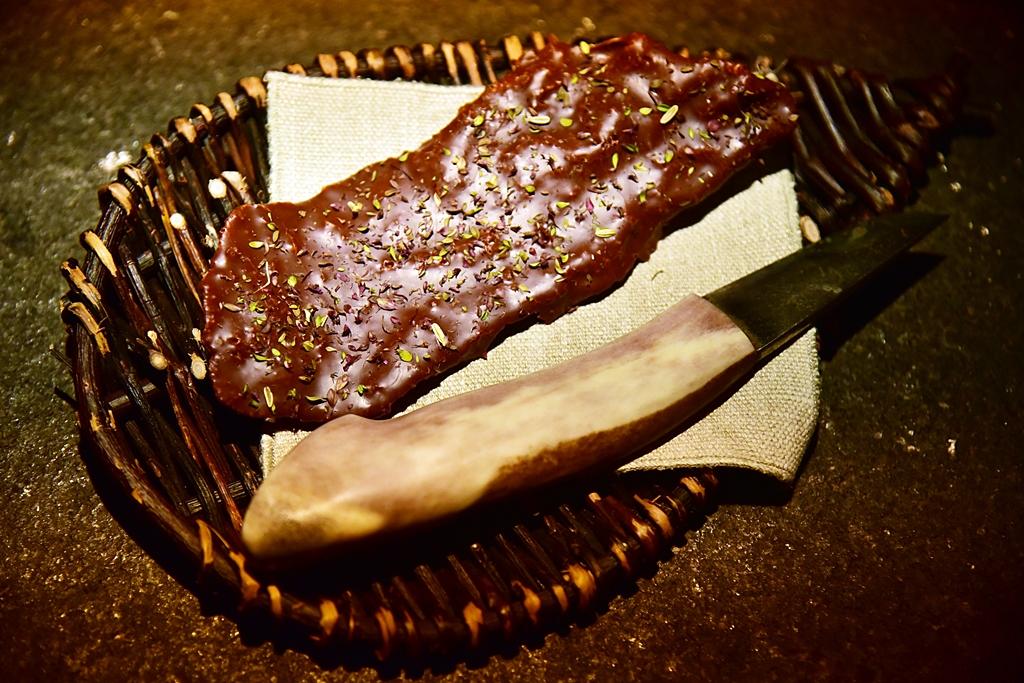 17th course: Chocolate Cod Skin – หนังปลาค้อดกรอบเคลือบดาร์กช็อกโกแลตเสิร์ฟมาคู่กับมีด นี่เป็นคอร์สเดียวใน Noma ที่รู้สึกเฉยๆครับ