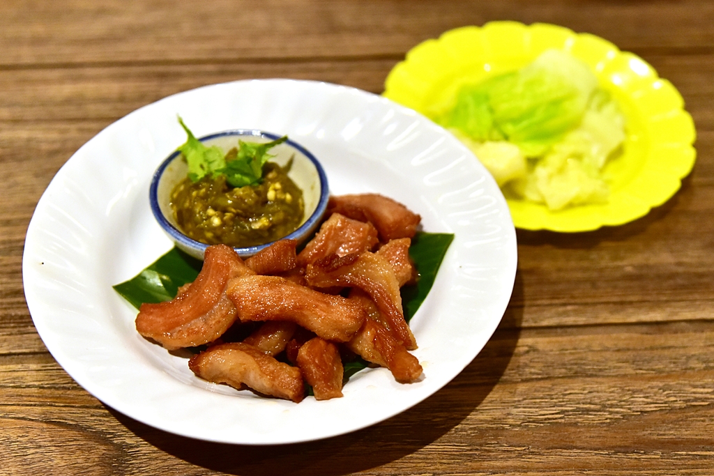 5. Fried Pork Shoulder with Green Chili Dip and Boiled Cabbage (99++ THB) – คอหมูทอดเสิร์ฟคู่กับน้ำพริกหนุ่มและกะหล่ำปลีนึ่ง
