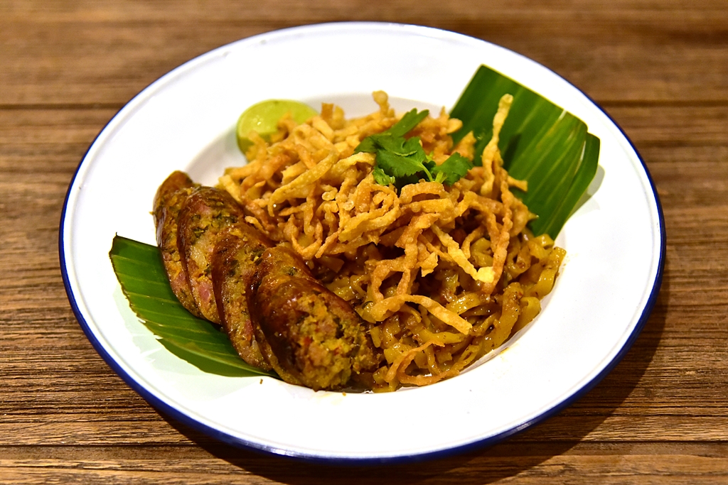 3. Stir-fried Khaosoi with Northern Style Sausage (99++ THB) – ข้าวซอยผัดไส้อั่วและเครื่องไส้อั่วรสชาติเข้มข้นถึงเครื่อง