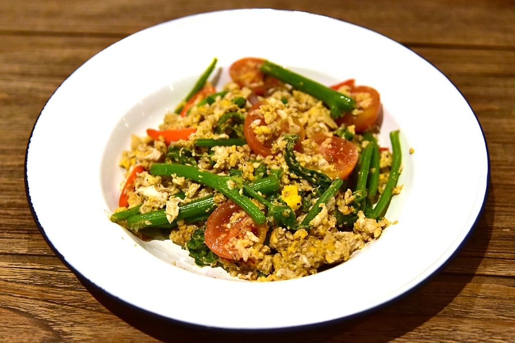 6. Stir-fried Pak Maew with Egg (119++ THB) – ผักแมวผัดไข่และมะเขือเทศ
