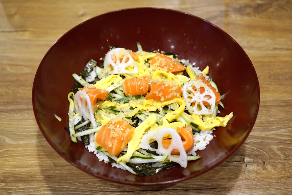 4. Salmon Chirashi (319+ THB) [13/20] – ข้าวหน้าปลาแซลม่อนดิบเสิร์ฟคู่กับไข่หวาน แตงกวาและเจลลี่โชยุ