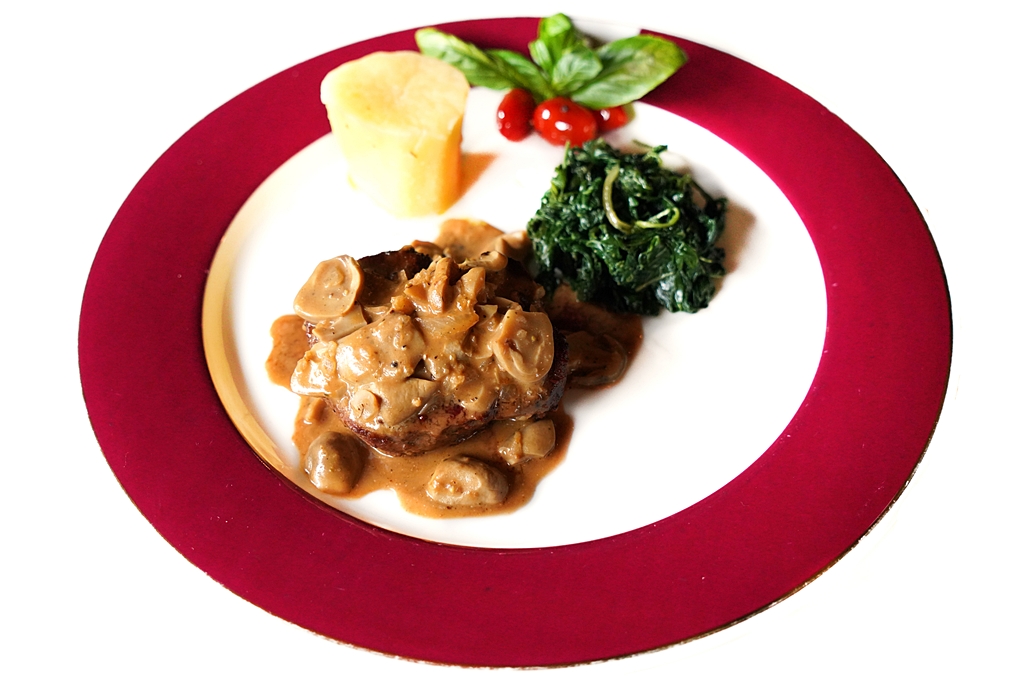 5. Beef Medallion in Mushroom Sauce (750++ THB) [14/20] – สเต็กเนื้อสันในย่างแบบมีเดียมราดด้วยซอสเห็ดรสชาติกลมกล่อมเสิร์ฟคู่กับมันฝรั่งและผักโขมผัด