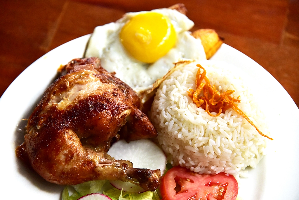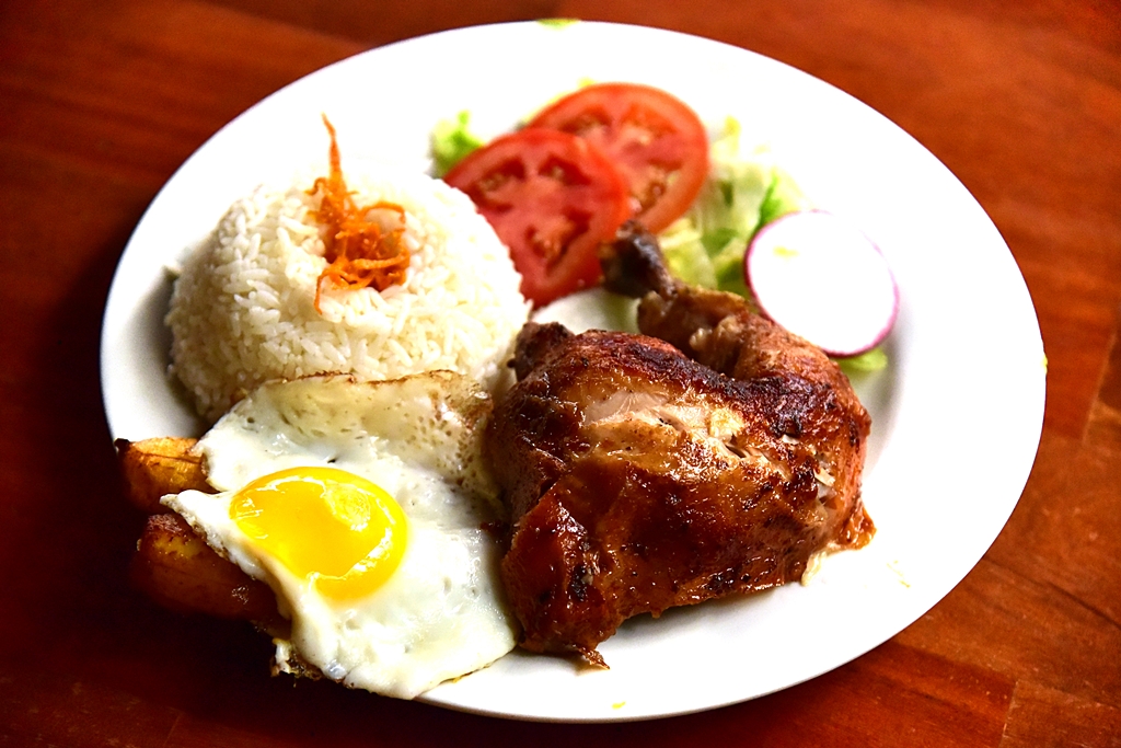 3. Rotisserie Chicken with Plantain and Fried Egg (18.90 Sol) – ไก่ย่างส่วนน่องติดสะโพกเสิร์ฟคู่กับข้าว ไข่ดาวและกล้วยหอมย่าง