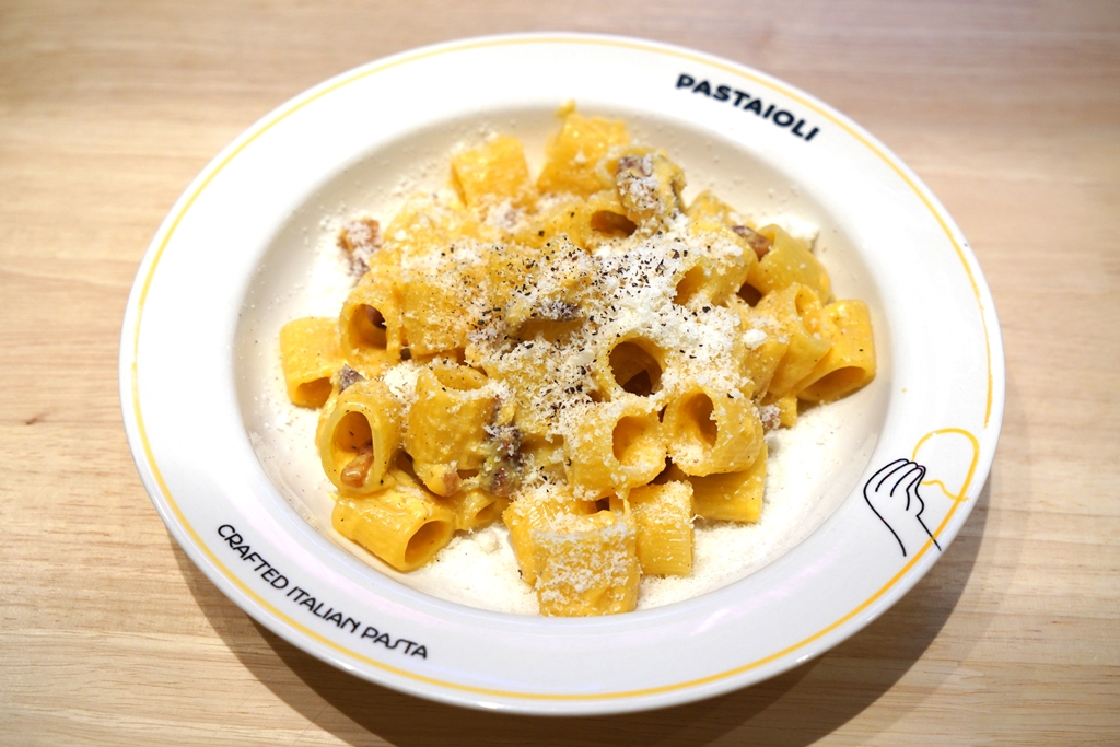 2. Mezze Maniche Carbonara (420 THB) [16/20] – พาสต้าเส้นหลอดสั้นแบบ Al Dente ในซอสคาร์โบนาร่าแบบดั้งเดิมที่มีเพียงแค่ไข่แดง แก้มหมูและชีส pecorino