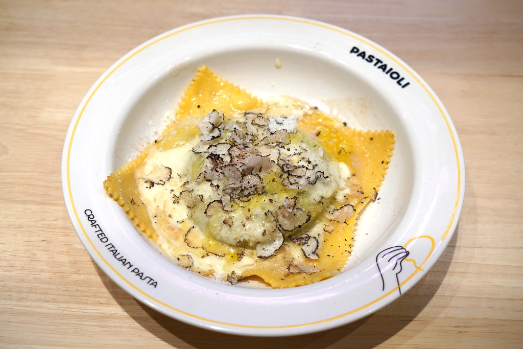 1. Raviolo Bergese (650 THB) [13/20] – พาสต้าแบบเกี๊ยวชิ้นโตไส้ผักโขม ไข่แดงและชีสริคอตต้าราดซอสพาร์มีซานและทรัฟเฟิล