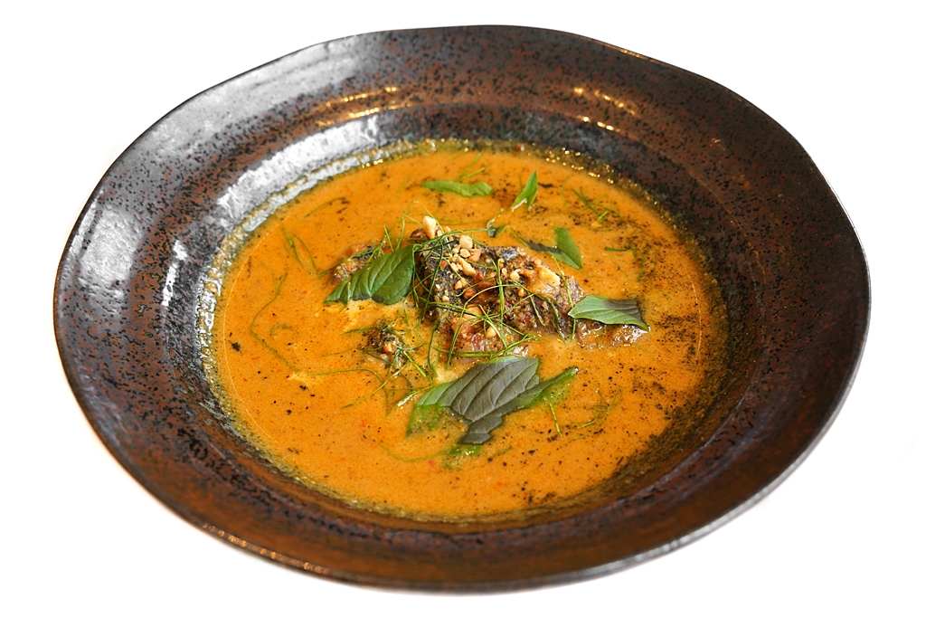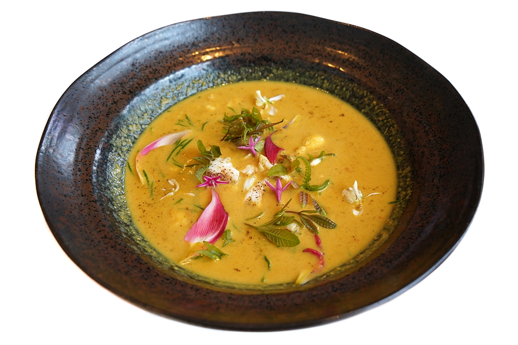 7. Smoky Southern Yellow Curry with Australian Spanner Crab, Hummingbird Flowers and Thai Samphire (1,400++ THB) [16/20] – แกงปูปักษ์ใต้รมควันใส่เนื้อปูจั๊กจั่นจากออสเตรเลีย ดอกแคและใบชะครามจากสมุทรสงคราม ตัวแกงรสชาติหอมหวานมันไม่เผ็ด ทานคู่กับข้าวสวยแล้วอร่อยแน่นอน