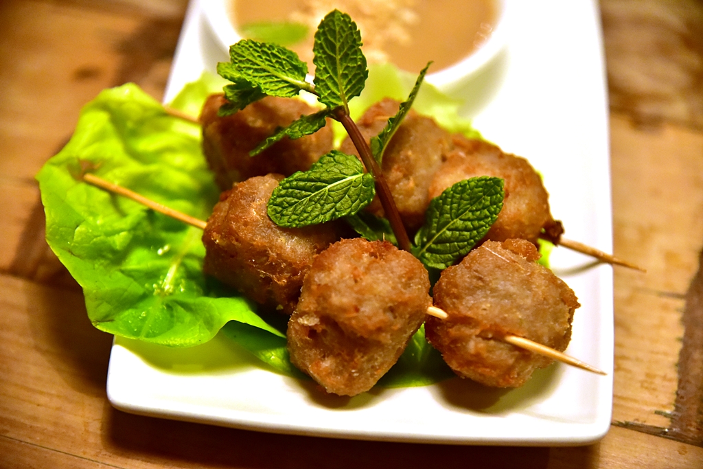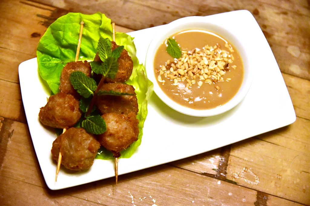 1. Nem Nuong Homemade Pork & Lemongrass Meatballs with Peanut Sauce (6.75 GBP) – แหนมเนืองแบบเนื้อหมูล้วนปั้นเป็นก้อนย่างเสิร์ฟคู่กับซอสถั่วลิสง