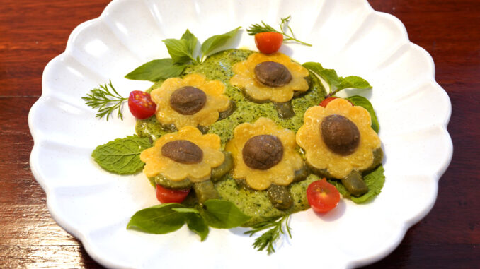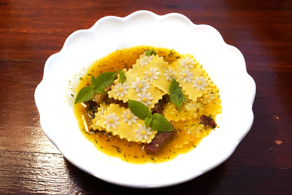 1. Sunflower Pasta (390 THB) [15/20] – ราวีโอลีโฮจิฉะไส้ชีสสามอย่างผสมเบค่อนรมควันกับยอกกี้มัทฉะมันญี่ปุ่นรูปดอกทานตะวันเสิร์ฟในซอสครีมเพสโต้
