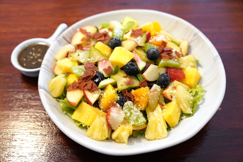 7. Mom’s Seasonal Salad (240 THB) [14/20] – ผักสลัดและผลไม้ตามฤดูกาลและตามใจคุณแม่ของเจ้าของร้านราดน้ำสลัดแบบญี่ปุ่น ซึ่งในรอบนี้ก็ได้ผลไม้หลากหลายชนิดแบบจุใจมากๆเลยครับ