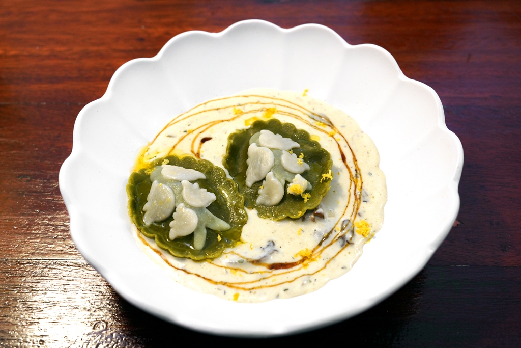 2. Lily Ravioli (380 THB) [14/20] – ราวีโอลีมัตฉะใบเตยไส้แซลมอนรมควันผสมครีมชีสเลมอนรูปดอกลิลลี่ในซอสครีมเห็ดวานิลลา