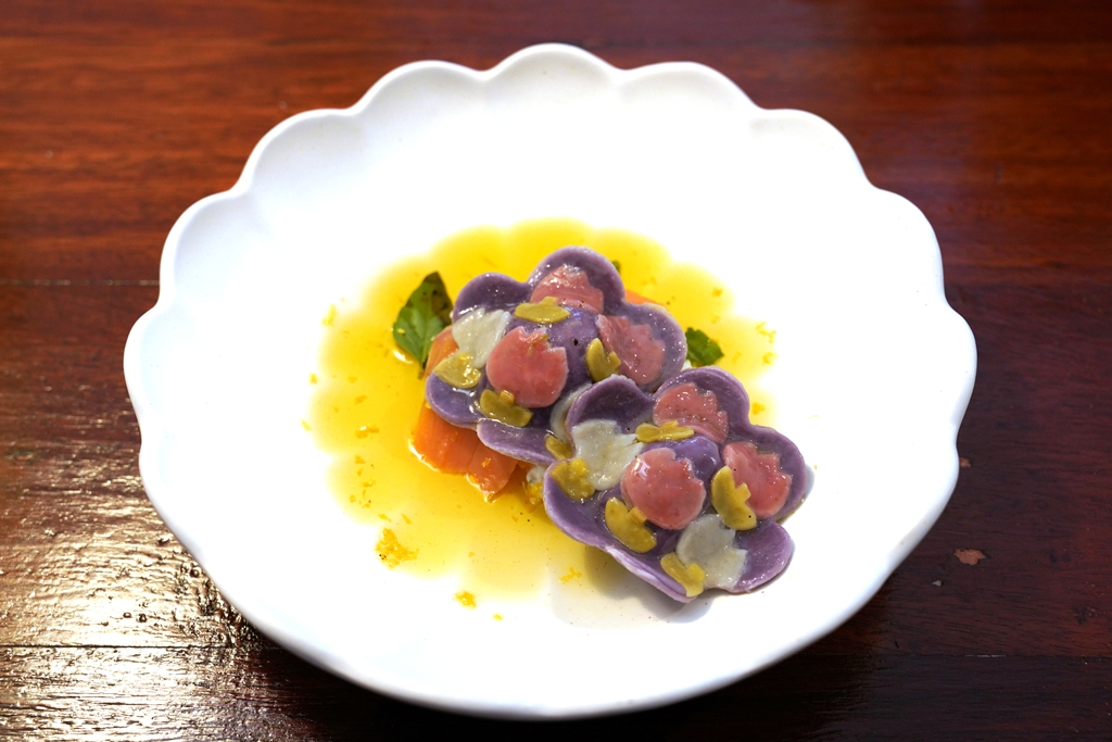 3. Tulip Ravioli (380 THB) [14/20] – ราวีโอลีมันม่วงไส้ริคอตต้าชีสเพสโต้ผสมแซลมอนรมควันรูปดอกทิวลิปในซอสครีมริคอตต้าชีสบัตเตอร์เลมอนคู่กับแซลมอนรมควัน