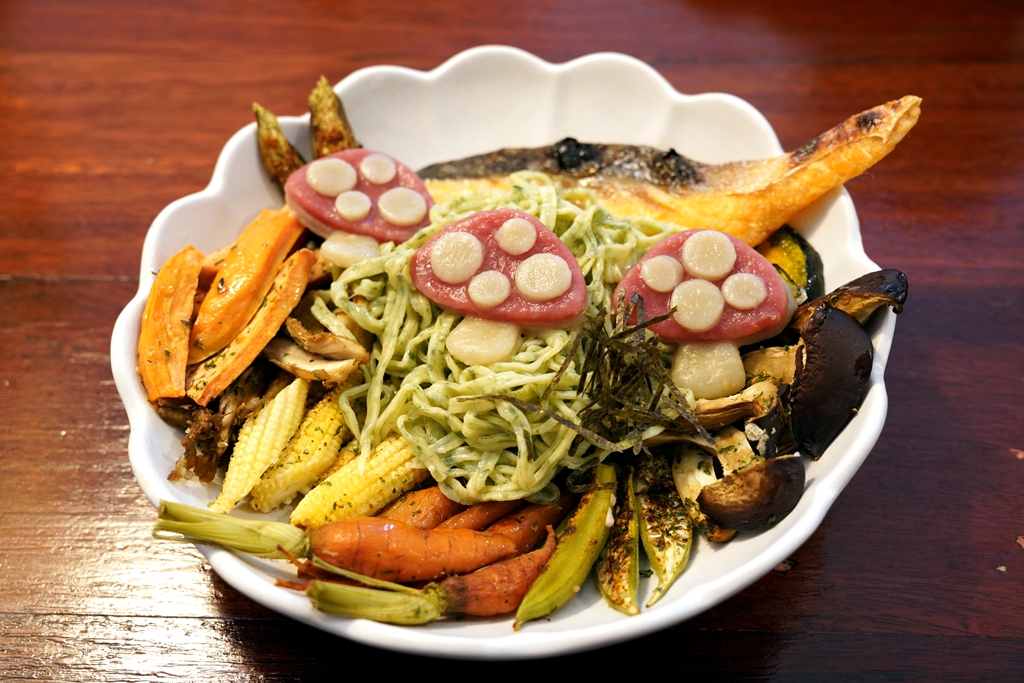 5. Super Zaru Cold Pasta (450 THB) [15/20] – แองเจลแฮร์เส้นสดผสมผักโขมและยอกกี้บีทรูทรูปเห็ดกับผักย่างตามฤดูกาลเสิร์ฟกับน้ำซุปปลาผสมเลม่อนแบบญี่ปุ่น