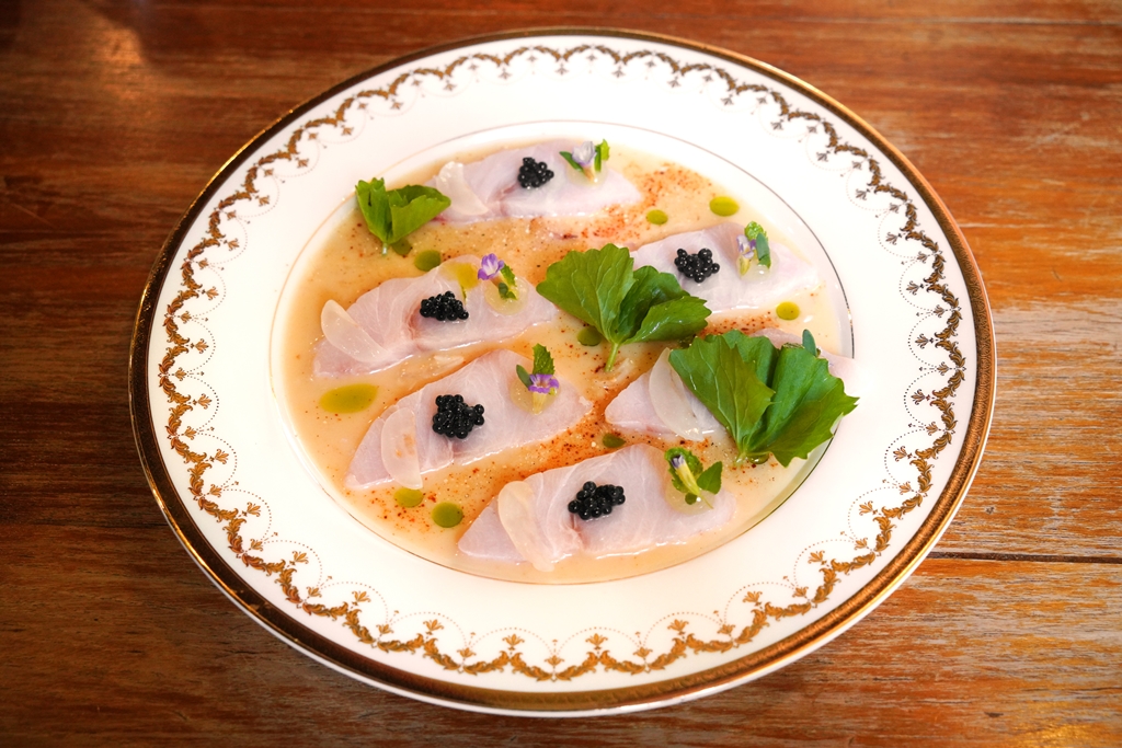 4. Giant Trevally Carpaccio with Thai Mackerel Head Caviar (560++ THB) [14/20] – ก้อยปลากะมงพร้าวดรายเอจ 7 วันเสิร์ฟแบบคาร์ปัชชิโอ้ในน้ำยำแมงดานาคู่กับแสร้งว่าคาเวียร์ที่ทำจากปลาทูและเนื้อลองกอง