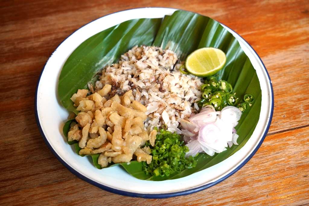 9. Soy Sauce Rice with Thai Mackerel (220++ THB) [14/20] – “ข้าวใหม่ปลามัน” ที่เป็นข้าวคลุกกับเนื้อปลาทูและซีอิ๊วเสิร์ฟคู่กับกากหมู มะนาว ผักชีและพริก
