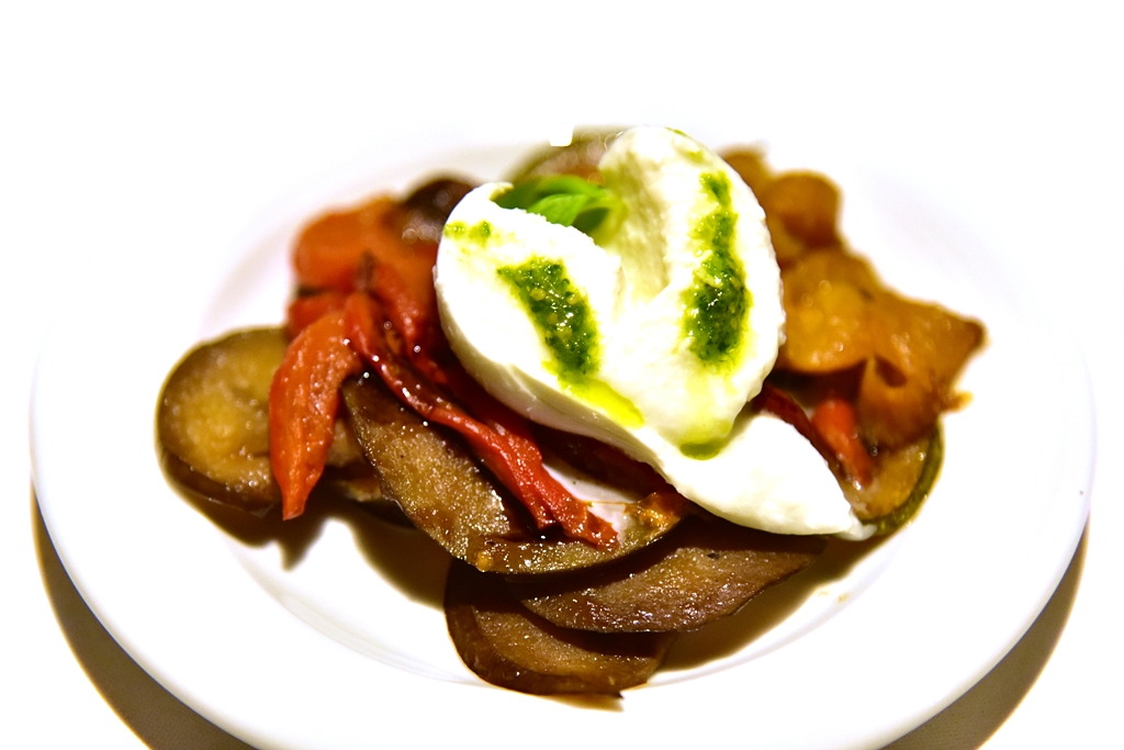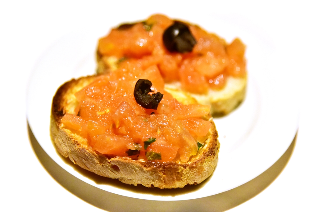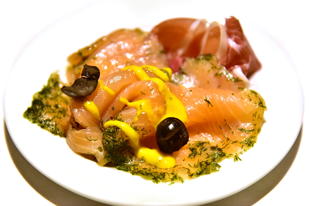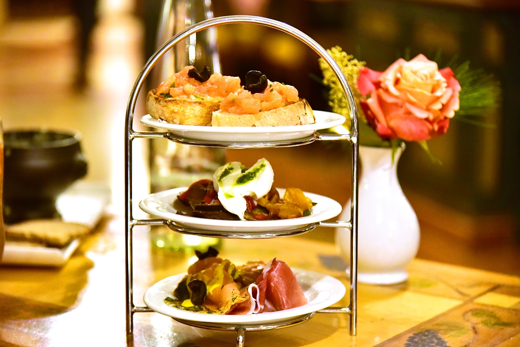 1. Hors d’oeuvre Tower (14.50 EURO) – เมนูเรียกน้ำย่อยสามรายการที่ประกอบไปด้วยขนมปังหน้ามะเขือเทศ ผักย่างเบอราต้าชีสและแซลม่อนรมควันกับแฮม