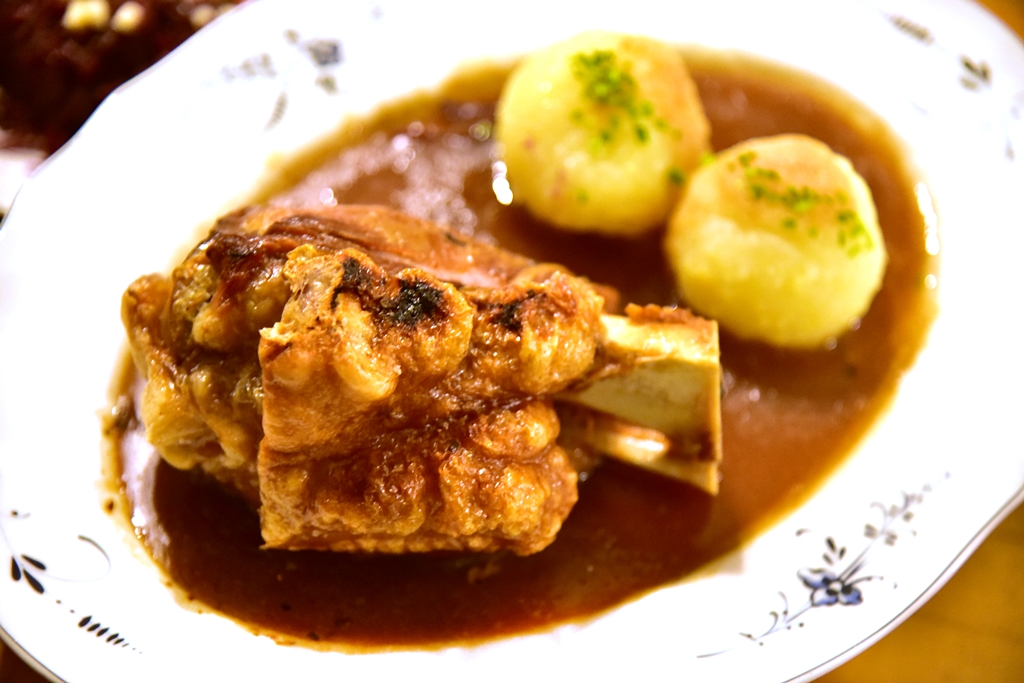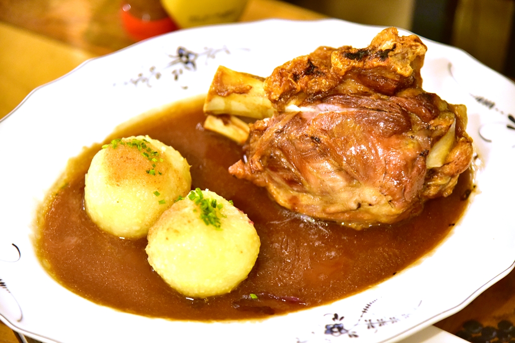 5. Schweinshaxe (20.00 EURO) – ขาหมูเยอรมันหนังกรอบเสิร์ฟคู่กับแป้งมันฝรั่งก้อนกลมและกะหล่ำปลีดอง