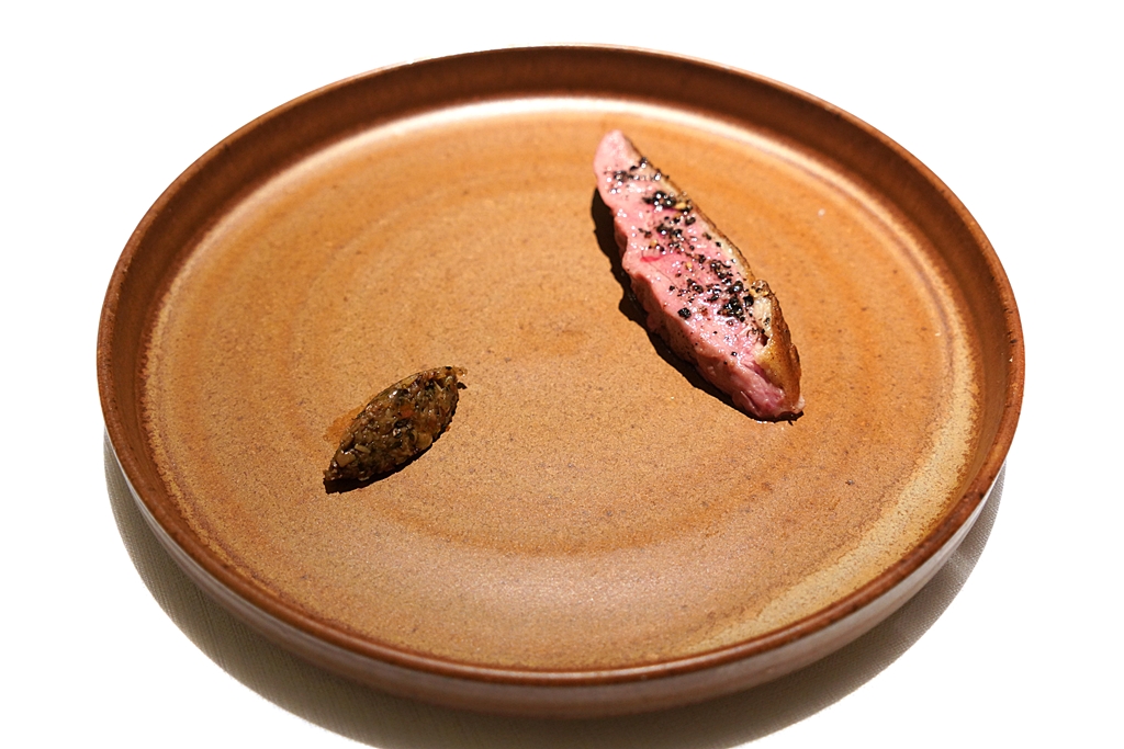 6th course : Grilled Duck, Magao [16/20] – เนื้อเป็ดดรายเอจนาน 5 วันย่างบนเตาถ่านแบบเนื้อนุ่มแต่หนังกรอบกรุบเสิร์ฟคู่กับพริกไทยป่าไต้หวันและเห็ดดุ๊กเซลล์ผัดหอมกรุ่น