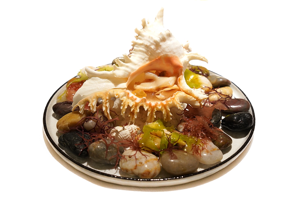 2nd course : “Hoy Mara” [15/20] – หอยสังข์มะระเสิร์ฟแบบดิบหมักกับโชยุและสาเกเนื้อกรุบหวานพร้อมด้วยมูสตับหอยรสละมุน