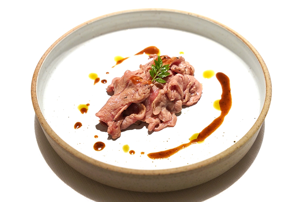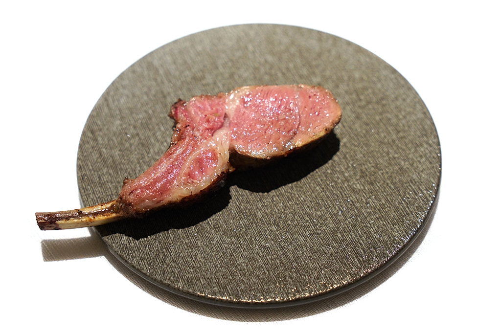 7th course : Jasmine Wagyu, Homemade Oyster Sauce, Leeks [14/20] – เนื้อวัววากิวจากเชียงใหม่ที่เลี้ยงด้วยข้าวหอมมะลินำมาปรุงให้สุกแบบ slow cook และย่างถ่านเล็กน้อย เสิร์ฟคู่กับซอยหอยนางรม น้ำมันต้นหอมและต้นหอมญี่ปุ่นย่างเกรียมๆ