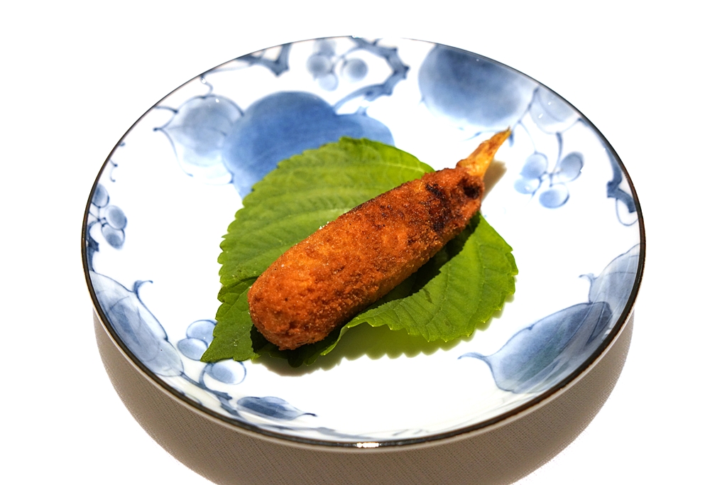 3rd course : Sand Whiting Fish, Sesame Leaf, Salted Plum [16/20] – ปลาเห็ดโคนแบบไร้ก้างชุบแป้งทอดกรอบรมควันร้อนๆเสิร์ฟบนใบงาเกาหลีพร้อมด้วยซอสบ๊วยเค็มตะลิงปลิง ถือเป็นเมนูของทอดที่มีหลายรสชาติมาก