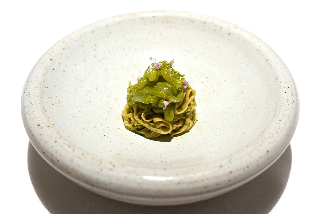 4th course : Squid, Shiso Pesto [15/20] – เนื้อปลาหมึกอาโอริอิกะนุ่มๆเสิร์ฟคู่กับเส้นบะหมี่สดในซอสเพสโต้ใบชิโสะหอมอบอวล