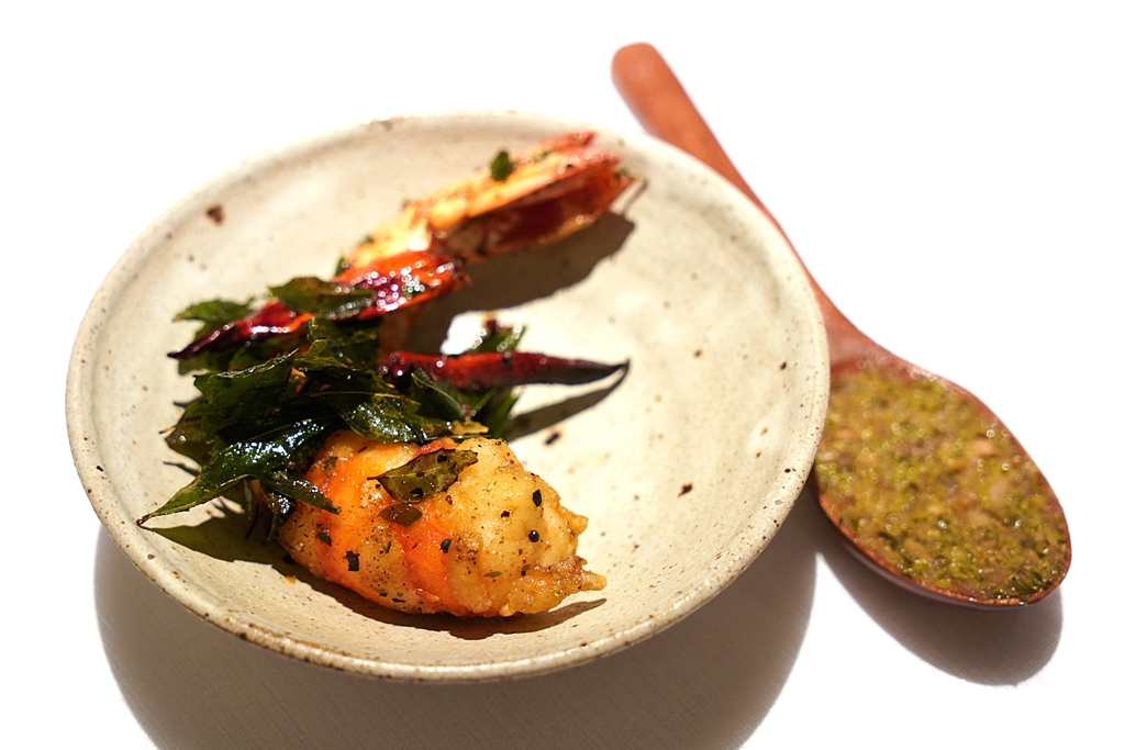 8th course : Tiger Prawn, Curry Leaf Masala [16/20] – กุ้งลายเสือตัวใหญ่ยักษ์เนื้อหวานกรอบผัดกับพริกแห้งและใบสมุนไพรสไตล์อินเดีย เสิร์ฟคู่กับซอสเครื่องเทศมาซาล่ารสเปรี้ยวเข้ากันอย่างลงตัว
