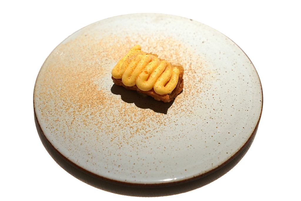 11th course : Yuzu, Sake [15/20] – พัฟหน้าไอศกรีมสาเกเสิร์ฟพร้อมกับมูสส้มยูสุรสเปรี้ยวเข้ากัน